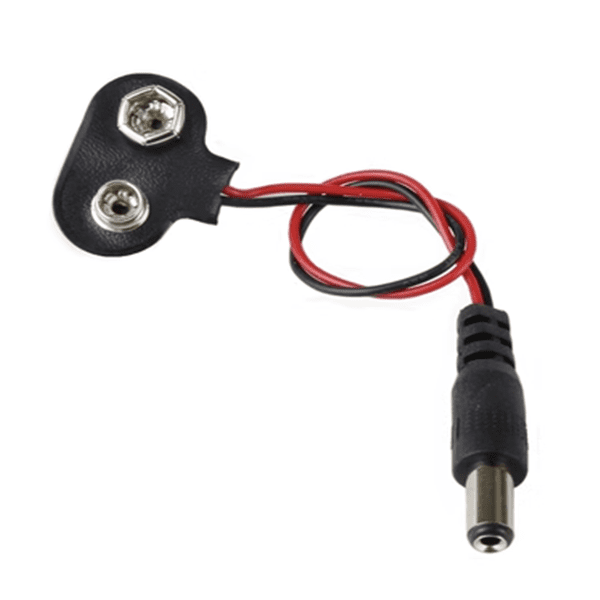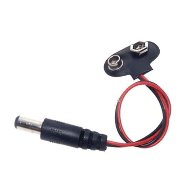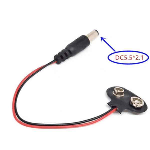 Adaptateur clip batterie 9V vers fiche DC, permettant de connecter facilement une batterie 9V à des appareils électroniques équipés d’une prise d’alimentation DC (jack). Ce câble est idéal pour alimenter des cartes Arduino, modules électroniques et petits projets DIY nécessitant une alimentation portable.