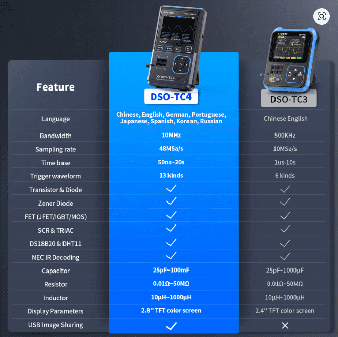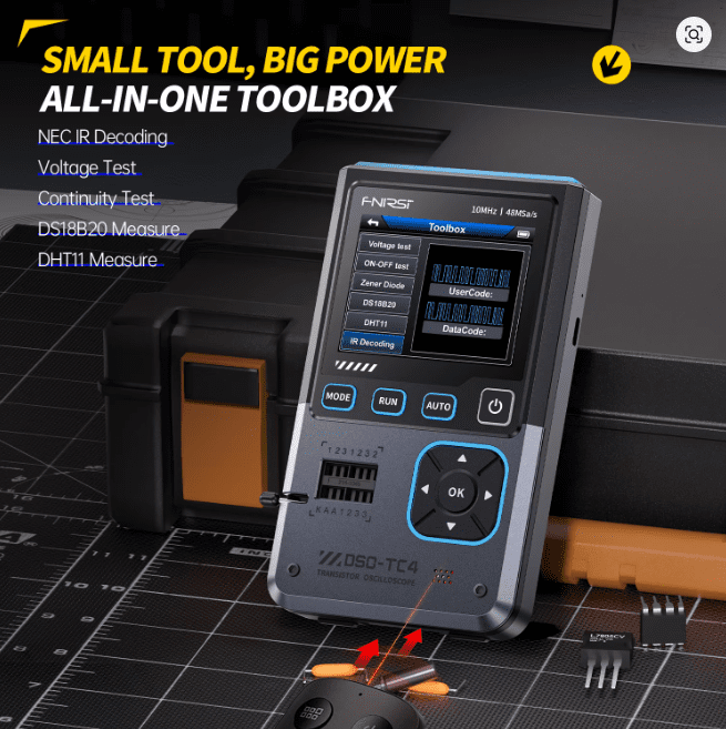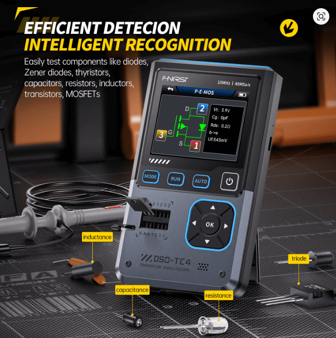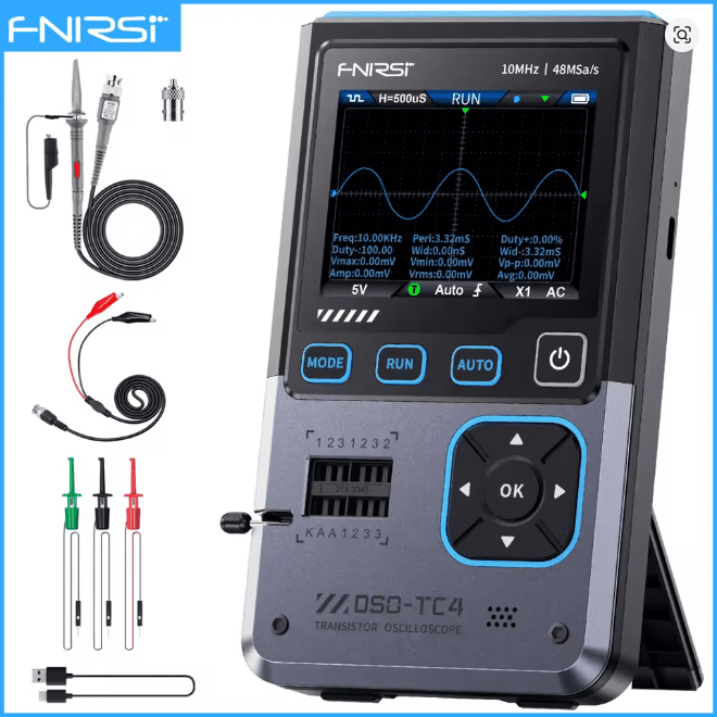 Le FNIRSI DSO-TC4 est un outil multifonction 3-en-1 combinant oscilloscope numérique, testeur de composants (LCR/transistors) et générateur de signal. Compact et puissant, il permet d’analyser, tester et diagnostiquer facilement vos circuits électroniques.