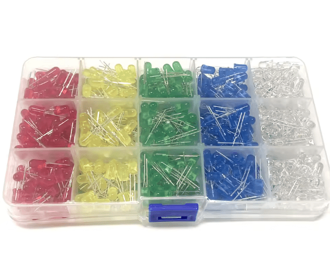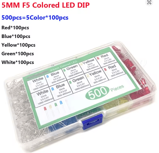 Ce kit de diodes électroluminescentes 5 mm (F5) regroupe un ensemble de LED multicolores idéal pour l’apprentissage, le prototypage et les projets électroniques DIY. Il comprend plusieurs couleurs standards largement utilisées dans les montages électroniques, l’indication visuelle et les expériences éducatives.