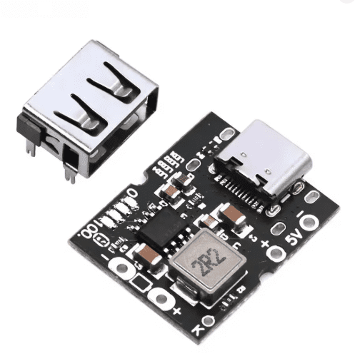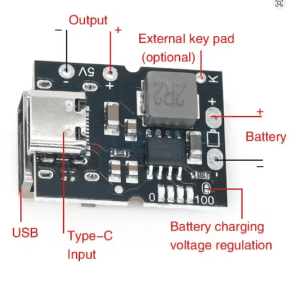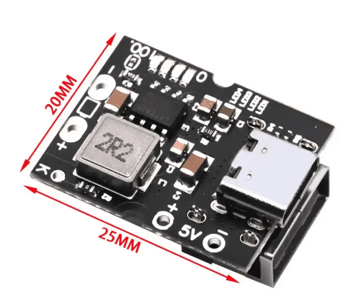 Ce module intégré de charge + décharge permet de charger une batterie lithium 3.7V (4.2V max) via USB Type-C, tout en fournissant une sortie 5V boostée (Step-Up) jusqu’à 2A.